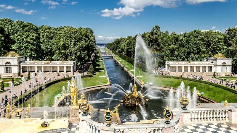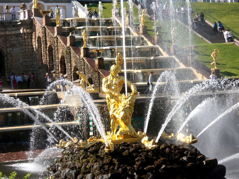 И разрывает тому пасть могучими руками. А из пасти льва, разорванной героем, вырывается высокая струя воды. У ног скульптуры размещены 8 позолоченных дельфинов-фонтанов, а в 4-х нишах у основания бьют потоки воды из львиных голов, олицетворяющих 4 стороны света. Фонтан Самсон самый крупный фонтан Большого каскада. Струя воды поднимается в высоту почти на 21 м.