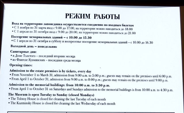 В автомате нужно купить билет — вход на территорию усадьбы Ясная поляна стоит 100 р. (детям бесплатно). Слева от входа на территории усадьбы экскурсионные кассы. Экскурсий много, каждые 10 минут для групп по 15 чел. Нам в 11ч. предложили только на 12ч. ближайшую (все забронировано). Экскурсия стоит 400р., без льгот, длится около 2ч. Пока ждали экскурсию погуляли возле большого пруда.