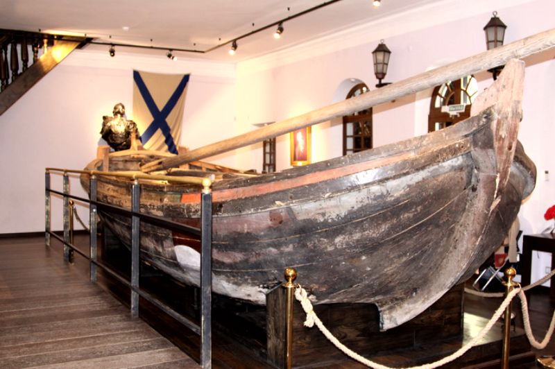 Здесь же проходили обучение первые российские офицеры-моряки. Пожар уничтожил всю флотилию, кроме одного бота «Фортуна». Он здесь и представлен.