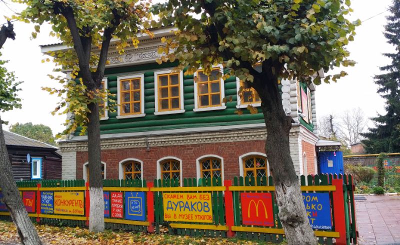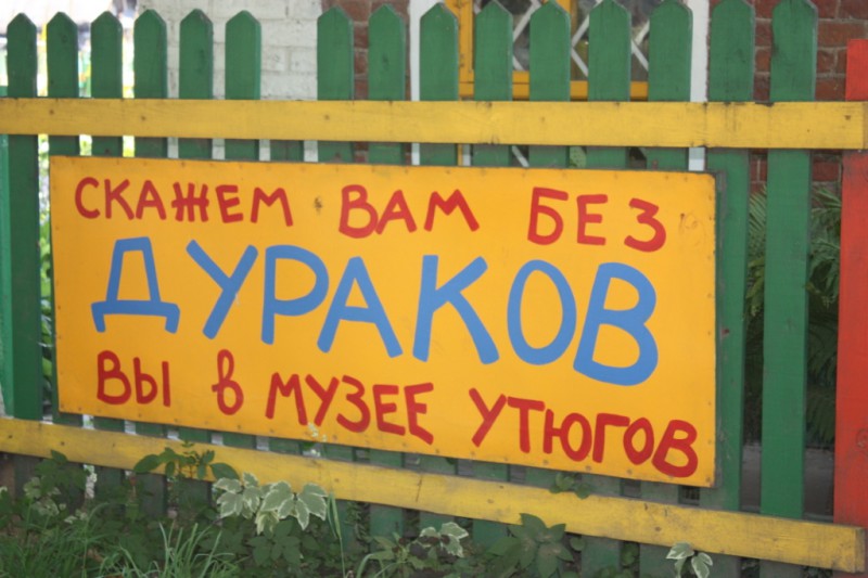 Вернувшись обратно в город, в самый его центр можно посетить 2 рядом расположенных (через дорогу) музея: музей Утюга и Музей Хитрости и смекалки. Их легко найти по шуточным вывескам на заборе.