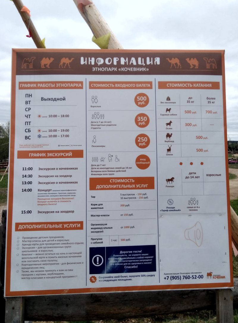 Покататься, покормить животных, пострелять из лука стоит отдельных денег. Ну, это по-нашему. Экскурсии — по графику.
