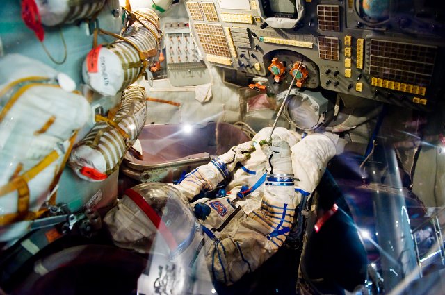 Есть и космонавт, выполняющий работы в каком-то отсеке.