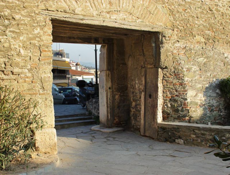 Над монастырем Влатадон возвышается северная стена крепостного укрепления города, соединяющаяся с Акрополем, служившим последним убежищем для горожан в момент вражеского нападения, куда ведут двое больших ворот, так и называемых — Портарес.