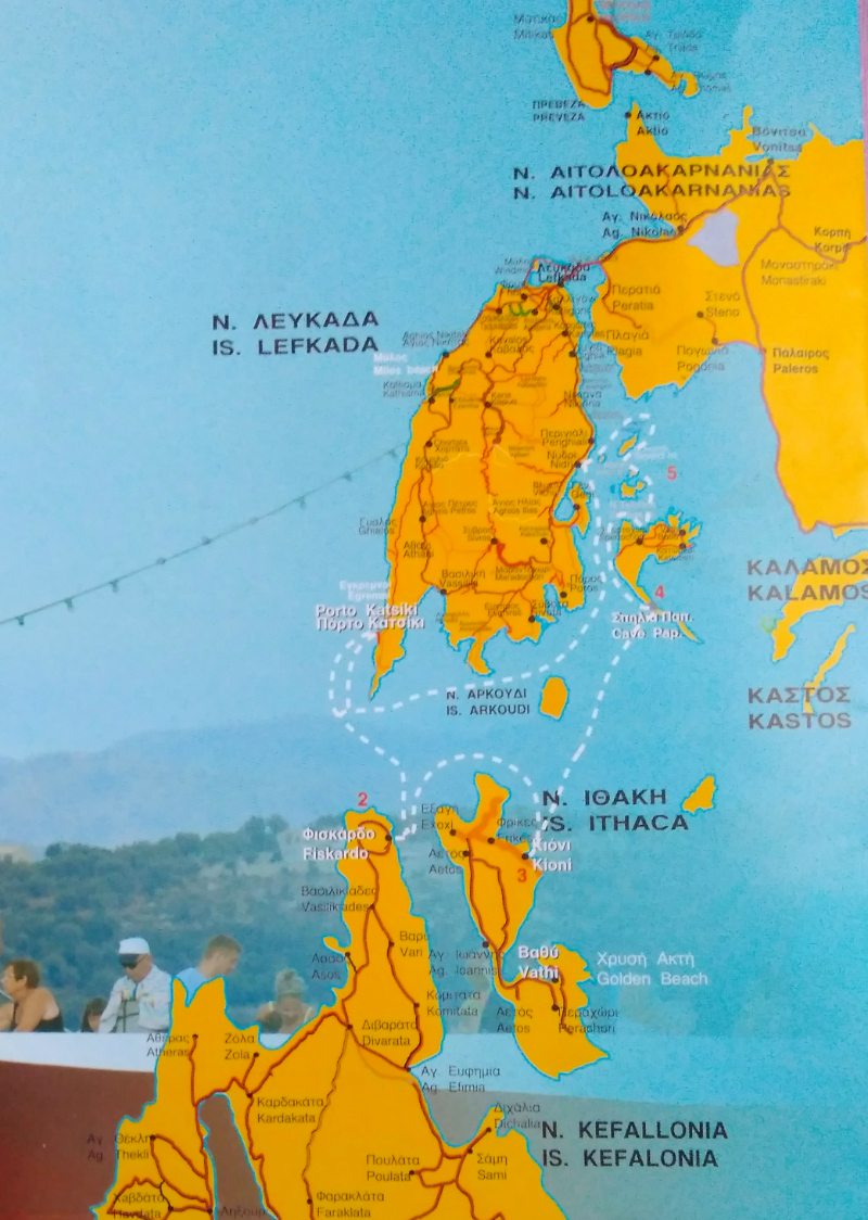 Маршрут нашего круиза был таким: Нидри — Василики — пляж в Катцики — о.Кефалонья — о.Итака — о.Скорпиосс — Нидри.