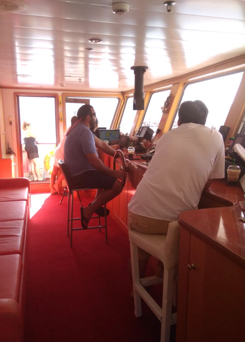 В капитанской рубке работает гид, которая иногда рассказывает о достопримечательностях (на греческом и английском).