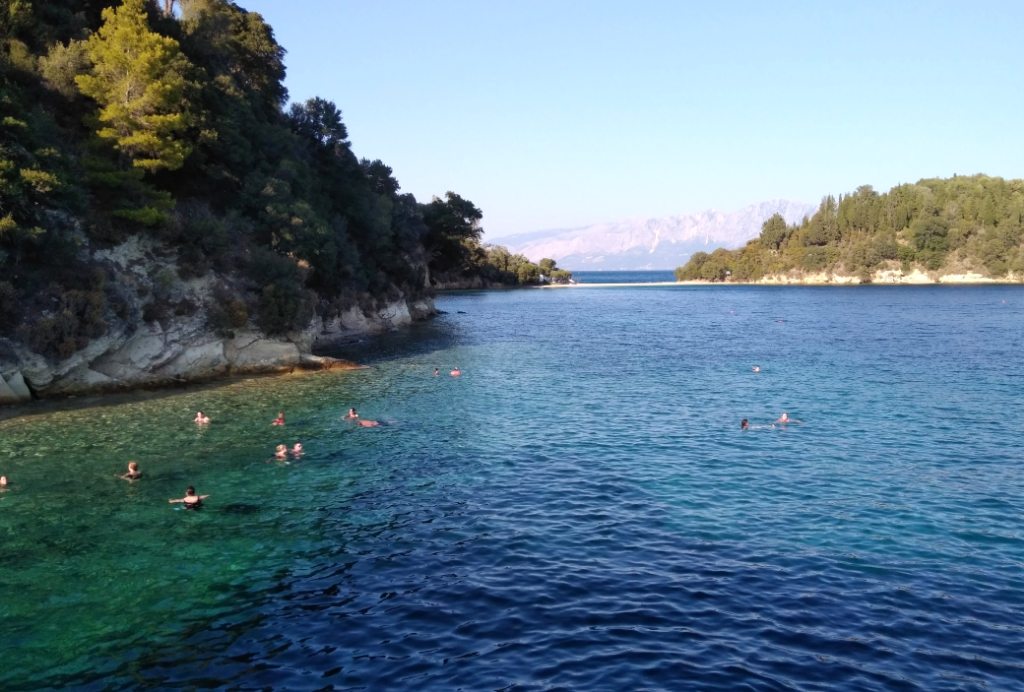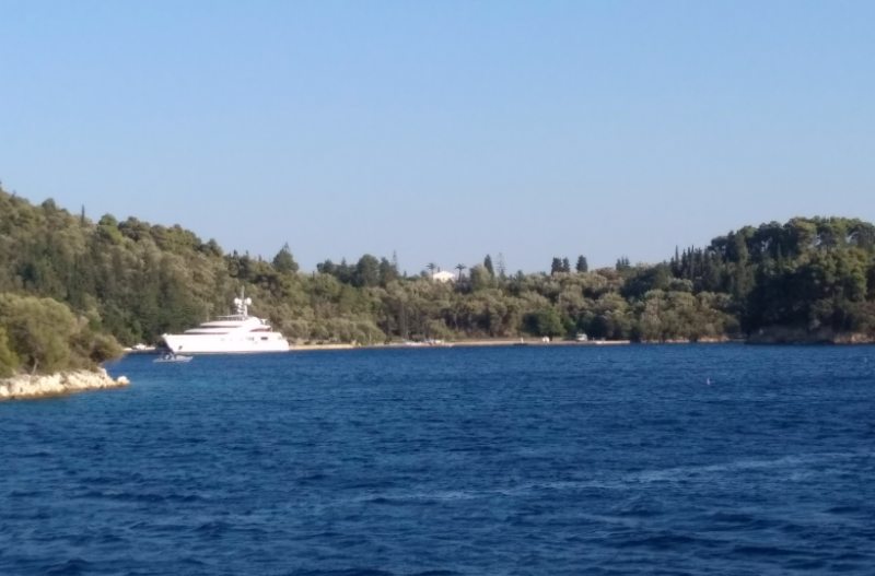 Тем не менее теперь к тому пляжу не подойти. Со стороны причала у берега виден катер охраны. Сейчас организаторы круиза предлагают купание вдоль скалистого берега острова Скорпиос. Тоже очень живописное место с изумительной водой.