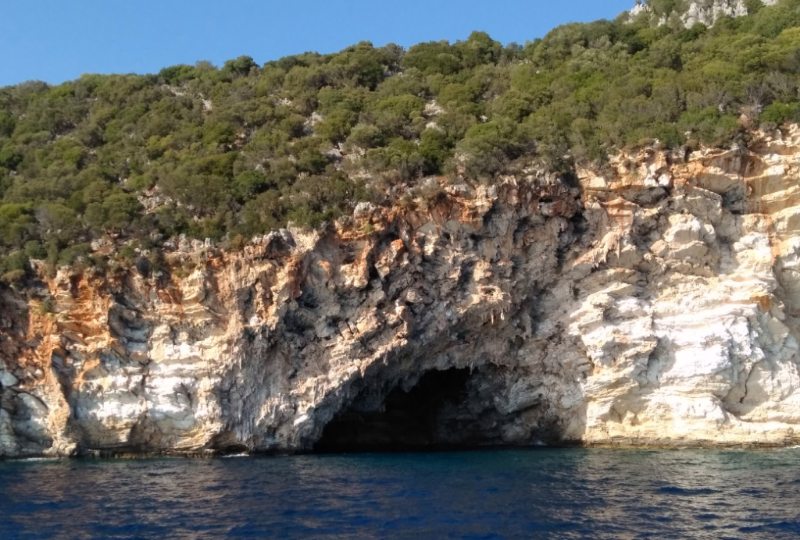 Вокруг Итаки любят отдыхать богатые европейцы на яхтах … А некоторые и острова небольшие покупают. Помните Онассиса, его остров Скорпиос? Остров для семейного отдыха… Внучка Онассиса решила его продать. Знаете кто купил Скорпиос? Его приобрел российский олигарх Рыболовлев. Заодно он приобрел и островок Спарти. И эти острова были следующим пунктом нашего путешествия. А по пути нам показали грот, который служил базой партизан во время Второй Мировой войны.