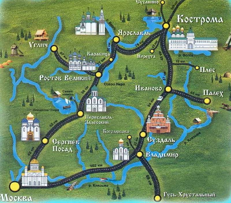 Золотое Кольцо — так называется созвездие древнейших городов центра России: Москва, Сергиев Посад, Переславль-Залесский, Ростов Великий, Кострома, Ярославль, Плёс, Владимир, Суздаль, Боголюбово, Юрьев-Польский, Муром, Гусь-Хрустальный, Палех, Калязин, Мышкин, Углич. Туристические маршруты по Золотому Кольцу позволяют увидеть уникальные архитектурные памятники Руси и ближе узнать историю России. Благодаря работе историков и реставраторов, поддержке жителей Золотого Кольца, большая часть памятников древней Руси сохранилась.