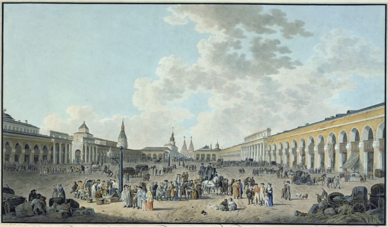 История ГУМ  началась со времен правления Ивана III. После пожара пустое место здесь заняли торговцы. В XVII веке при Екатерине II  на месте обветшавших лавок началось проектирование грандиозного торгового центра в стиле классицизма. Проект разработал сам Кваренги, но строительство велось городскими архитекторами. После пожара 1812 года торговые ряды перестроил другой мастер классицизма Осип Бове.