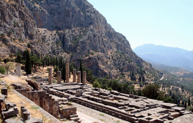 Руины окружены высокими горами, уступами, скальными ущельями и деревьями. Дельфы расположены на высоте 700 метров, и на расстоянии 164 километра от Афин. Они впечатляют в любое время года.