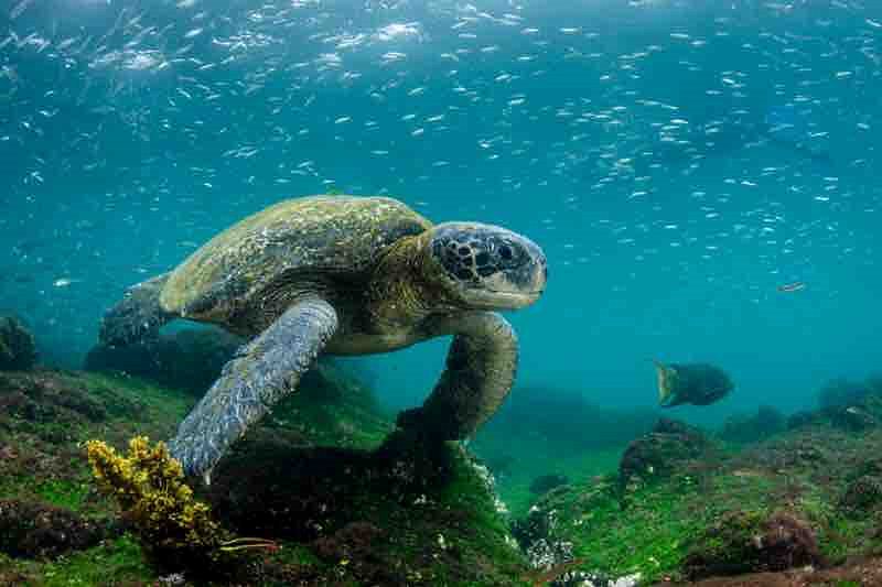 Слоновые черепахи, обитающие на Галапагосах очень древние. А их размеры достигают 1,5 метров в длину. Эти долгожители запросто доживают до своего 100-летнего юбилея, а многие живут и дольше. Есть вероятность встретить черепашку, помнящую еще самого Дарвина.
